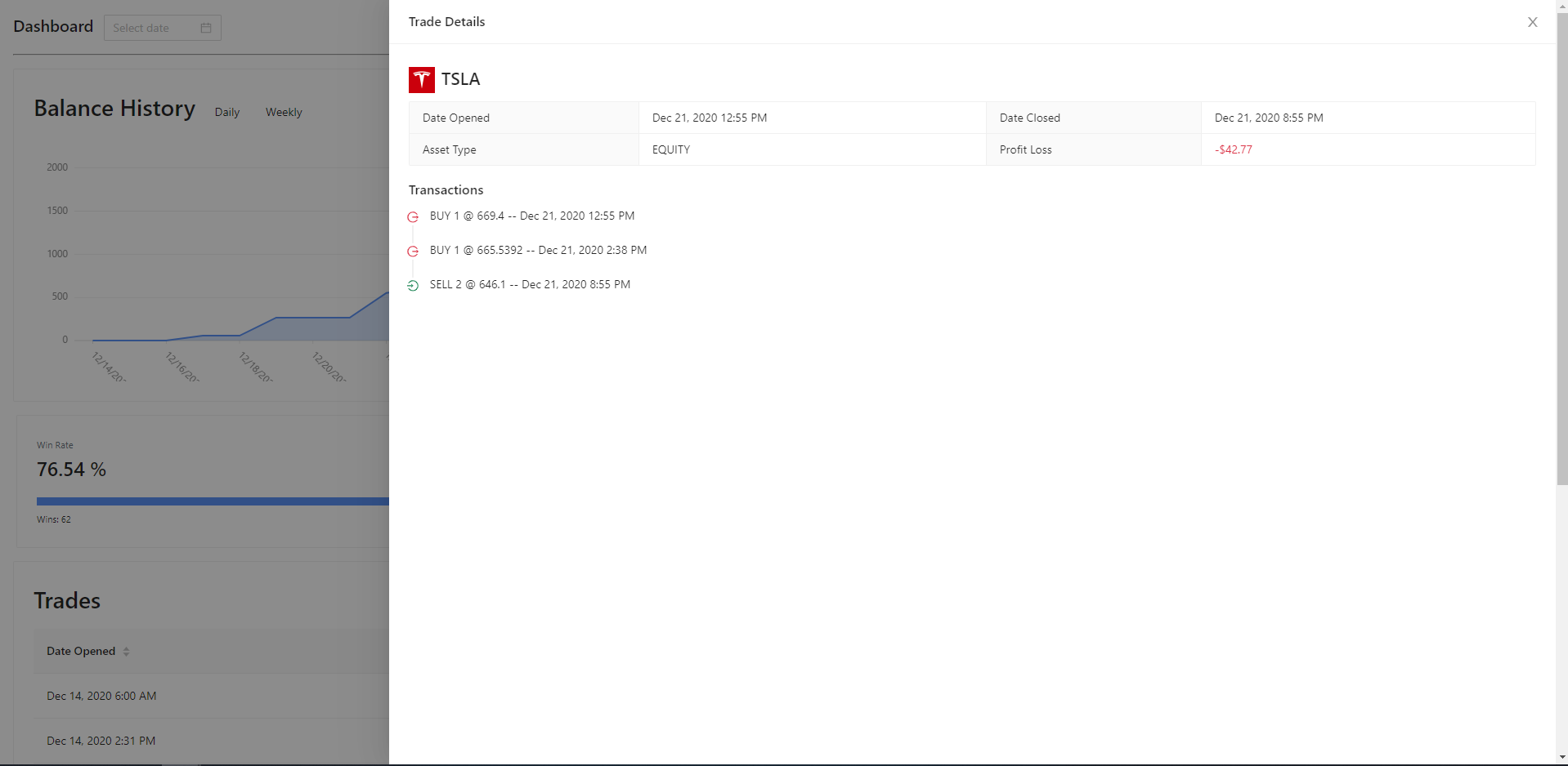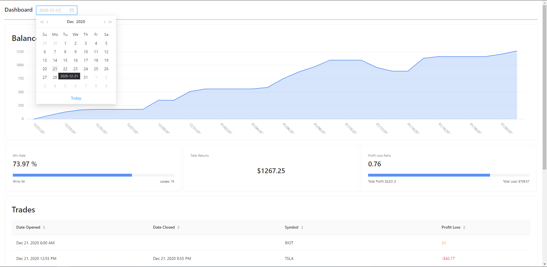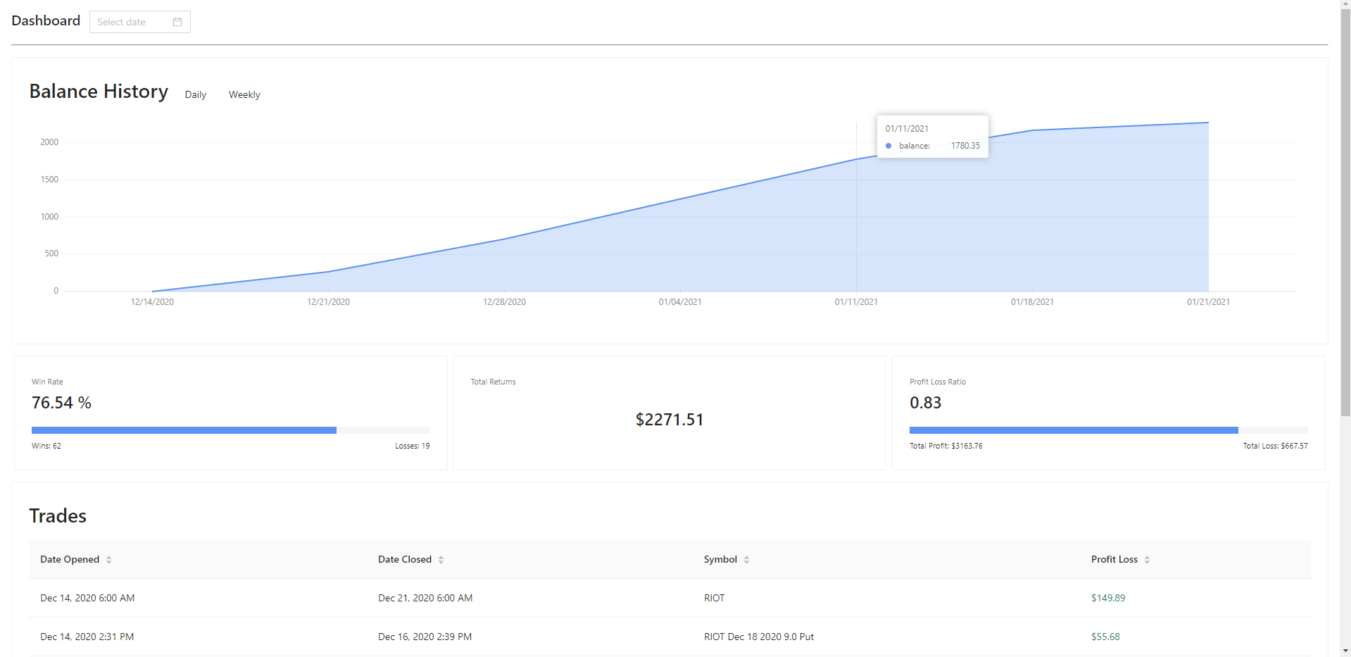 I created an application to help me log my trades in the stock market. It interfaces with TD Ameritrade's API to fetch my transactions, and calculates statistics such as net profit/loss, win rate, and profit/loss ratio. It groups all related transactions together under one trade so it's easier to see how the transactions relate to each other, and what the final profit/loss is once the trade is completed. Users can change the start date, as well as the chart's display (daily or weekly increments). Feel free to click on an image to view it in fullscreen if you wish to inspect it further.